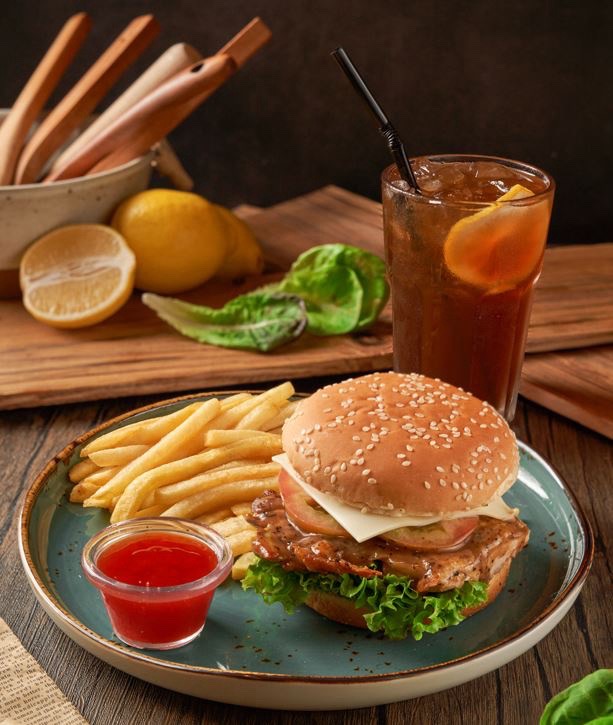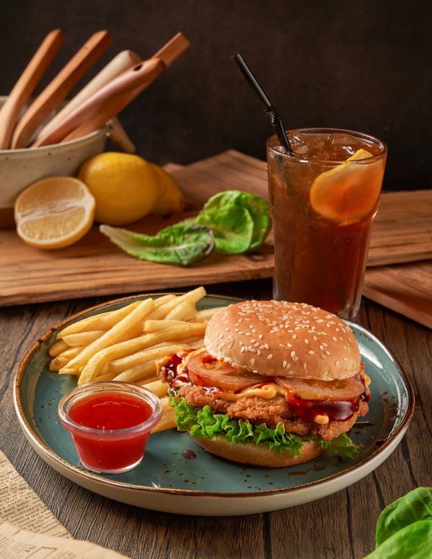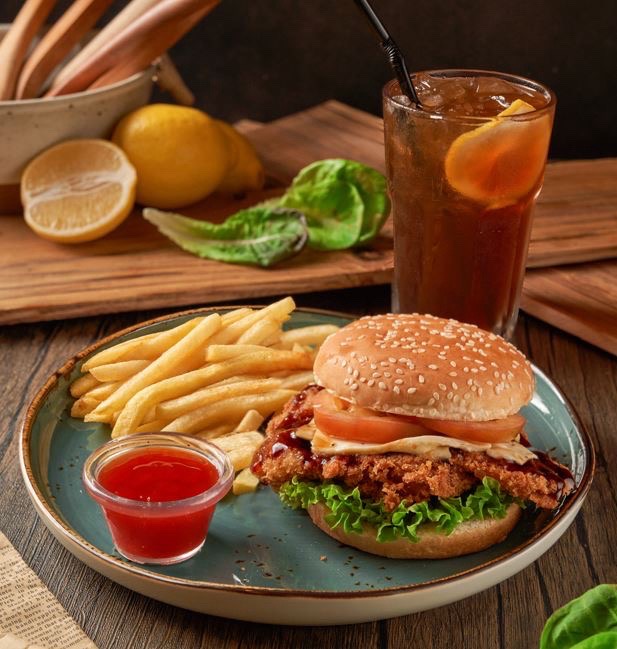 136 BBQ Cheesy Crispy Chicken Burger & Ice Lemon T
